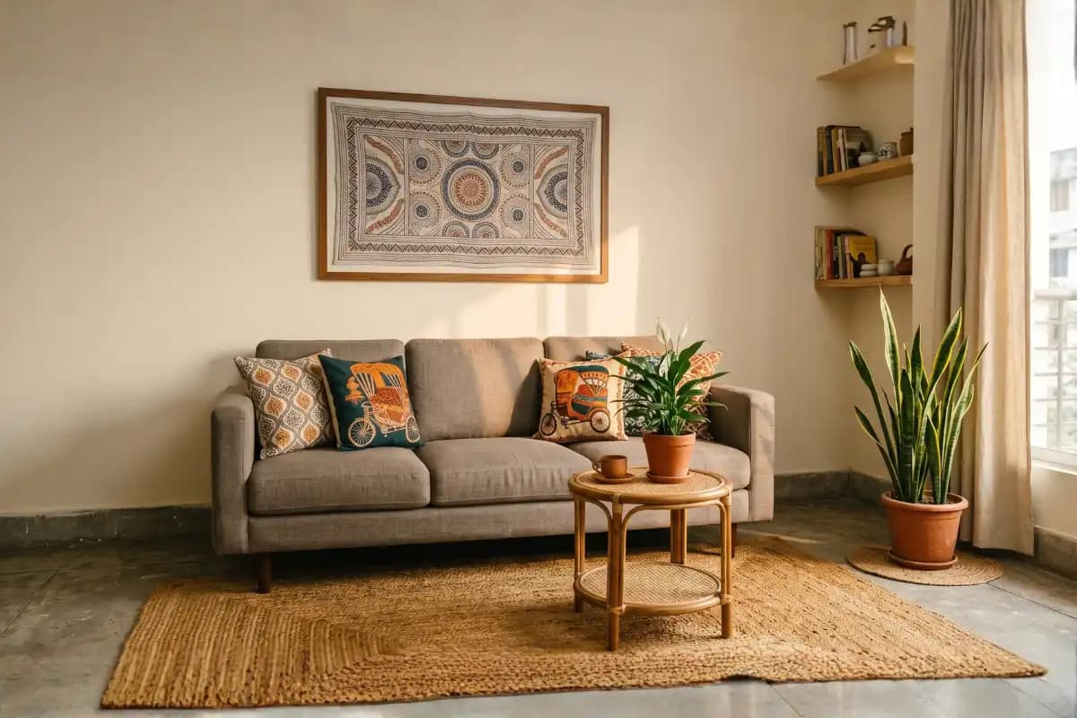 Sizing matters enormously For a more layered, contemporary look, place a smaller coloured dhurrie or woven rug on top of the jute base. This rug-layering technique is trending globally and works exceptionally well. Here is something most people overlook: cushion covers are the fastest and most affordable way to completely change the personality of a drawing room. In Bangladesh, they are also an opportunity to bring genuine craft heritage into the home. Mughal and Rickshaw art cushion covers are a particularly compelling choice rickshaw art brings the vivid, narrative folk tradition of Bangladesh's iconic street culture into the intimacy of the home, while Mughal-inspired geometric and floral embroidery carries a sense of historical richness that elevates even a simple sofa arrangement. For a cohesive look, work with two to three complementary colours. Mix solid and patterned covers. Use different sizes standard square cushions alongside rectangular lumbar cushions to add depth and visual layering along the sofa. Wooden stools are another underestimated essential. A pair of compact wooden stools beside the main sofa can serve as side tables, additional seating when guests arrive, or decorative elements when not in use. Locally crafted stools with turned legs and hand-carved detailing add tremendous character to a modern drawing room. Traditional Bengali living room decoration ideas are not a niche trend they are a return to something that was always there, waiting to be rediscovered. There is a quiet but growing movement among Bangladeshi homeowners particularly younger urban professionals to reclaim their cultural heritage through interior design. Start with natural materials as your foundation: Jute rugs, cane furniture, shegun wood, terracotta planters, cotton and muslin soft furnishings these materials are not only culturally resonant but climatically sensible. Use a warm, earth-toned base palette: The traditional Bengali colour vocabulary saffron, terracotta, mustard, indigo, forest green is bold and rich. In a modern drawing room, these colours work best as accents against a neutral backdrop. A cream or warm white wall allows a saffron cushion or a deep green curtain to command attention without overwhelming the room. Prioritize handmade over mass-produced: A nakshi kantha panel framed behind glass, a hand-thrown terracotta planter, a woven basket used as storage every handmade element brings warmth and human presence that no factory product can replicate. This is one of the core principles of traditional Bengali room decoration. A bare wall is the single biggest missed opportunity in most Bangladeshi drawing rooms. Two art traditions stand out as particularly powerful for room decoration wall displays. The Mughal artistic traditionintricate geometric patterns, stylized floral motifs, jewel-toned palettes has shaped the visual culture of Bengal for centuries. Framed Mughal miniature prints or embroidered panels inspired by Mughal textiles translate beautifully onto a drawing room wall. For maximum impact, create a gallery arrangement of three to five prints in matching dark wood or antique brass frames. Keep surrounding decor restrained so the art breathes. Rickshaw art is Bangladesh's most distinctly contemporary folk art tradition bold outlines, flat vivid colour, floral borders, narrative scenes. A single large-scale rickshaw art panel as the drawing room's focal wall is a genuinely breathtaking decorating choice. For a more gallery-style approach, a curated grid of smaller panels creates a modern effect that feels both globally current and deeply Bangladeshi. Whichever tradition you choose, invest in quality framing. Position wall art at approximately 145 to 150 centimetres (cm) from the floor to the centre of the artwork this is the standard eye-level position that makes gallery walls feel intentional rather than random. Any honest guide to drawing room decoration in Bangladesh has to address the summer because it runs from March to October and it affects every single decorating decision you make. Choose breathable materials: Polyester sofas, synthetic rugs, and foam-heavy cushions trap heat. Natural materials breathe cotton, linen, jute, cane, and rattan allow air to circulate, keeping the room cooler and more comfortable through the peak heat months. Maximise natural ventilation: If your drawing room has cross-ventilation potential, do not block it with furniture. Keep pathways between windows clear. Use sheer curtains that move with the breeze they add visual life and keep air flowing rather than pooling. Swap your soft furnishings seasonally: This is a simple, low-cost trick with a genuine impact. Replace warm-toned or heavy-fabric cushion covers with light cotton or muslin alternatives in cooler blues, greens, and whites during summer. Protect your furniture from humidity: High humidity warps wood, grows mildew on fabric, and degrades upholstery adhesives. Use silica gel packs inside wooden furniture, ensure airflow around all large pieces, and treat fabric upholstery with a fabric protector spray. Use plants as natural coolers: Beyond aesthetics, peace lilies, snake plants, and aloe vera contribute to air purification and mild humidity regulation. Placed near windows with indirect light, they improve both the look and the ambient comfort of the room. Even the most well-intentioned drawing room decoration can go wrong. And in Bangladesh, where apartment sizes are compact and budgets often tight, a single mistake can throw off the entire space. Here are the most common ones and how to avoid them. 1. Buying furniture before measuring the room This is the number one mistake in Dhaka apartments. A sofa that looks perfectly sized in a showroom can swallow an entire drawing room once it is inside. Always measure your floor space first, mark it out with tape if needed, and only then shop. A slim three-seater almost always serves a compact room better than a bulky L-shaped set. 2.