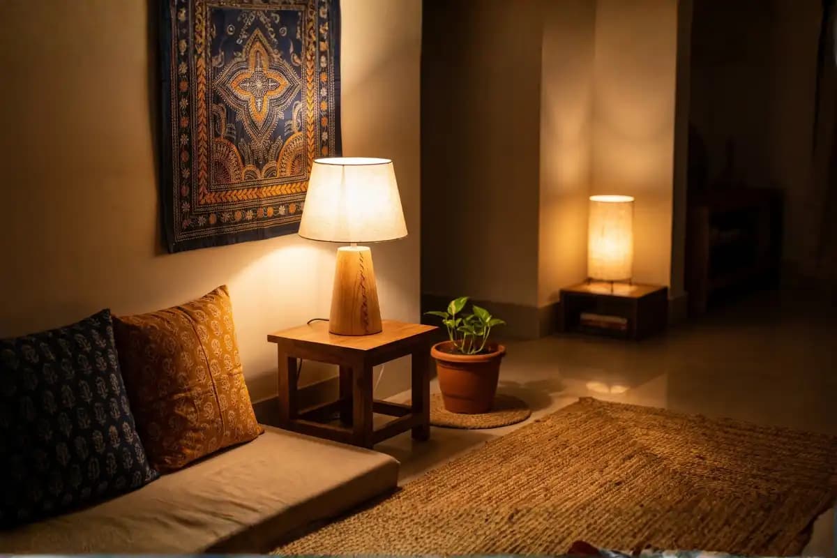 In a Dhaka apartment where the bedroom doubles as a study or work-from-home space, simple room decoration ideas like switching to a warm LED table lamp before bed produce measurable quality-of-life improvements. Harsh overhead lighting is a common decorating mistake in Bangladeshi apartments. Cool-toned fluorescent tubes or LED panels (5000K–6500K) create a sterile environment and emit more radiant heat than warm alternatives. During the intense April-to-September heat season, these fixtures make rooms feel less comfortable and harder to keep cool. No depth or shadow: Single overhead sources eliminate natural shadows, creating a flat, office-like appearance that makes even high-quality furniture look dull. Radiant heat contribution: High-wattage LED and CFL panels generate heat at the ceiling, raising temperatures in rooms already struggling with Dhaka’s 38°C to 40°C summers. Sleep disruption: Cool overhead lighting suppresses melatonin production for up to 90 minutes. Switching to warmer tones is a simple fix that significantly improves sleep quality. The solution is layered lighting. It is an ambient base from a warm overhead source, complemented by room decoration lights at table and floor level. Pairing this with good window treatments, including quality blackout curtains that block summer sunlight, keeps the room cool and beautifully lit simultaneously. Ideal decorative lighting for Bangladeshi homes features warm color temperatures below 3000K, low heat output, and glare-free diffusion. Energy-efficient 7 to 10-watt LED bulbs provide bright illumination with almost no radiant heat and last up to 25,000 hours. Check the Kelvin rating: Choose "Warm White" or "Soft White" bulbs with a rating of 2700K to 3000K. Avoid "Daylight" (6500K) or "Cool White" bulbs for relaxation areas. Match the CRI: A Color Rendering Index (CRI) above 80 ensures wood, fabric, and textiles look vibrant and accurate rather than washed out. Choose dimmable options: Dimmable warm LEDs allow you to adjust both brightness and heat, making them perfect for transitioning from reading to sleep. Consider wattage: Use 7–9 watts for bedroom table lamps and 12–15 watts for living room table lamps to provide ample light without generating excess heat. Fabric and glass fixtures serve different roles in a Bangladeshi home. A fabric lamp diffuses a warm 360-degree glow without glare, while glass fixtures create bright points of light with less ambient warmth. For bedroom use, fabric is the superior choice for both comfort and style. Heat management: Fabric shades facilitate natural convection of heat around the bulb, whereas glass enclosures trap heat and raise localized temperatures during hot summers. Light quality: Cotton or linen shades filter out harsh blue light and enhance warm tones, producing a soft, comfortable amber glow. Humidity Resistance: High-quality fabric resists moisture-induced discoloration better than painted glass, which often streaks when humid monsoon air meets a warm surface. Browse fabric table lamps crafted from local handloom cotton that diffuse warm light beautifully while complementing jute, wood, and textile interior palettes common in Dhaka apartments. Bedroom decoration works best when lighting is layered across three zones: ambient, task, and accent. Most Dhaka bedrooms rely on a single overhead light, wasting much of the room’s decorative potential. Adding table lamps, bedside reading lights, and low accent fixtures creates depth, highlights textiles, and supports the body’s natural wind-down before sleep. Ambient zone: A warm-white overhead LED at 2700K, set low, provides base illumination. If using a ceiling fan with a light kit, replace the default cool bulb with a warm-white LED bulb immediately. Task zone: Bedside table lamps at 400 to 500 lumens with a fabric shade provide reading light that stays on one person's side without flooding the entire room. Accent zone: A low-wattage warm LED strip behind the headboard, a floor-level lamp in the corner, or a small decorative lamp on a dresser creates visual layers that signal calm and comfort. Choosing between warm and cool bedroom lighting is simple. Cool light above 3500K suppresses melatonin and ruins sleep quality. In Dhaka, where urban light pollution already disrupts your internal clock, keeping your bedroom a warm-light zone from sunset onward is essential for better rest. Square and round table lamps serve distinct roles in Dhaka apartments. Square lampshades add geometric definition to desks and consoles, while round lamps create a soft, harmonious look on circular tables. When fitted with warm-white LEDs, both shapes provide essential ambient lighting for compact spaces without generating excess heat. Height alignment: Keep the bottom of the lampshade at eye level (24–30 inches from the floor) while seated. This ensures the space is well-lit without causing direct glare in your eyes. Pairs create balance: Placing identical lamps on either side of a bed or sofa creates a symmetrical, intentional look that makes a room feel larger and more organized. Corner placement: Position a large lamp in a corner to reflect light off two walls. This maximizes its ambient glow and significantly increases the room's perceived warmth. Explore the watercolor square lampshades handcrafted by Kaaruj artisans, which combine traditional Bangladeshi textile craft with a modern geometric lampshade form that suits minimalist and maximalist Dhaka interiors equally. Ambient lighting is the most accessible way to decorate without renovations or structural changes. For Dhaka renters, battery-operated lamps and LED string lights provide immediate impact at a low cost. The Corner Lamp: Place a fabric lamp in a dark corner to eliminate visual heaviness and open up the room. Shelf Lighting: Use a warm LED strip behind books to turn a shelf into a glowing art display. Bedside Pair: Position two small lamps on either side of the bed for an instant 