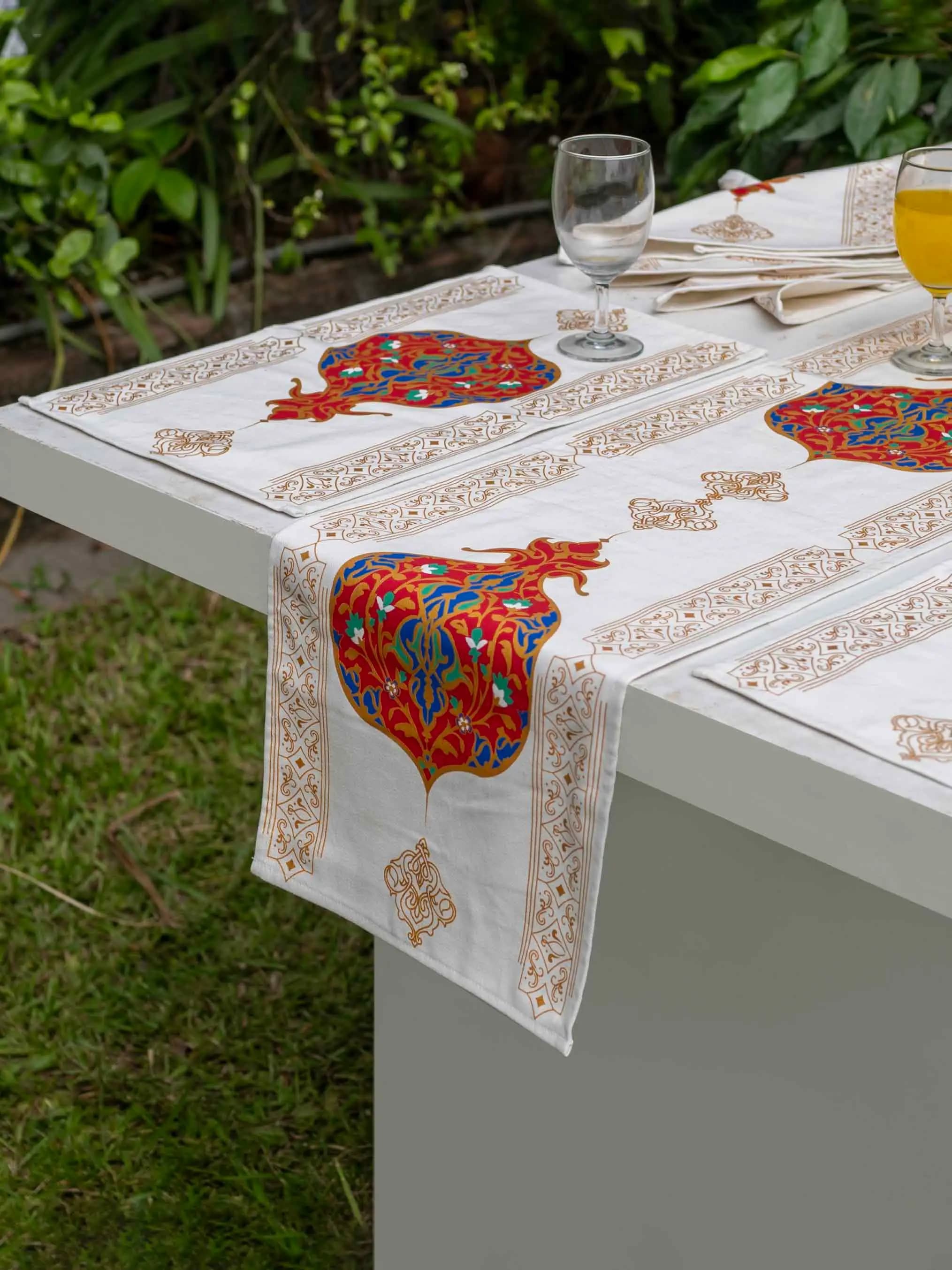 Enhance your dining table with this stylish Arabic-themed runner and placemat set. Crafted from premium twill fabric, the screen-printed design brings a cultural charm to your home. The set includes a runner and matching placemats for a coordinated look.