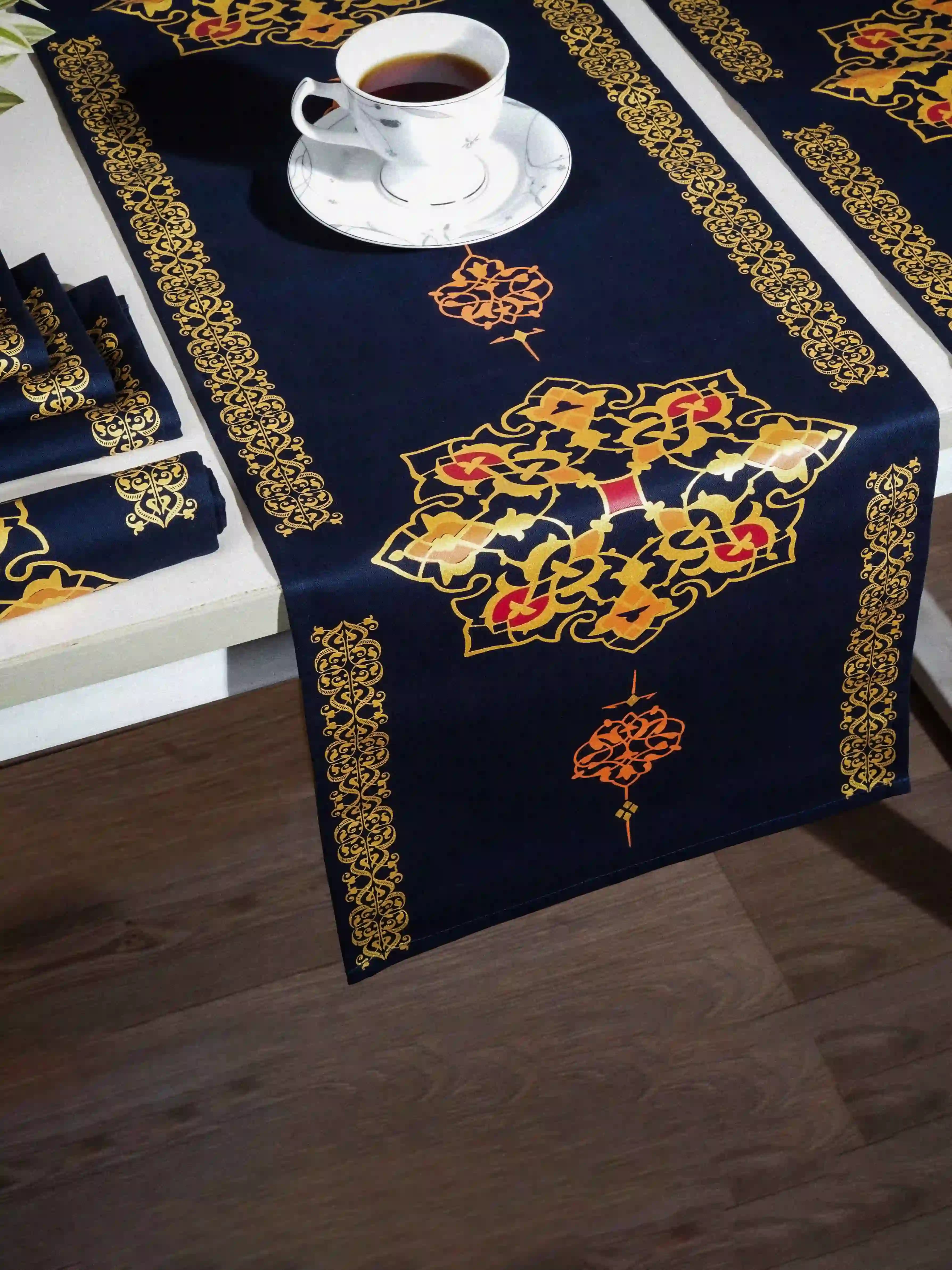 Enhance your dining table with this stylish Arabic-themed runner and placemat set. Crafted from premium twill fabric, the screen-printed design brings a cultural charm to your home. The set includes a runner and matching placemats for a coordinated look.