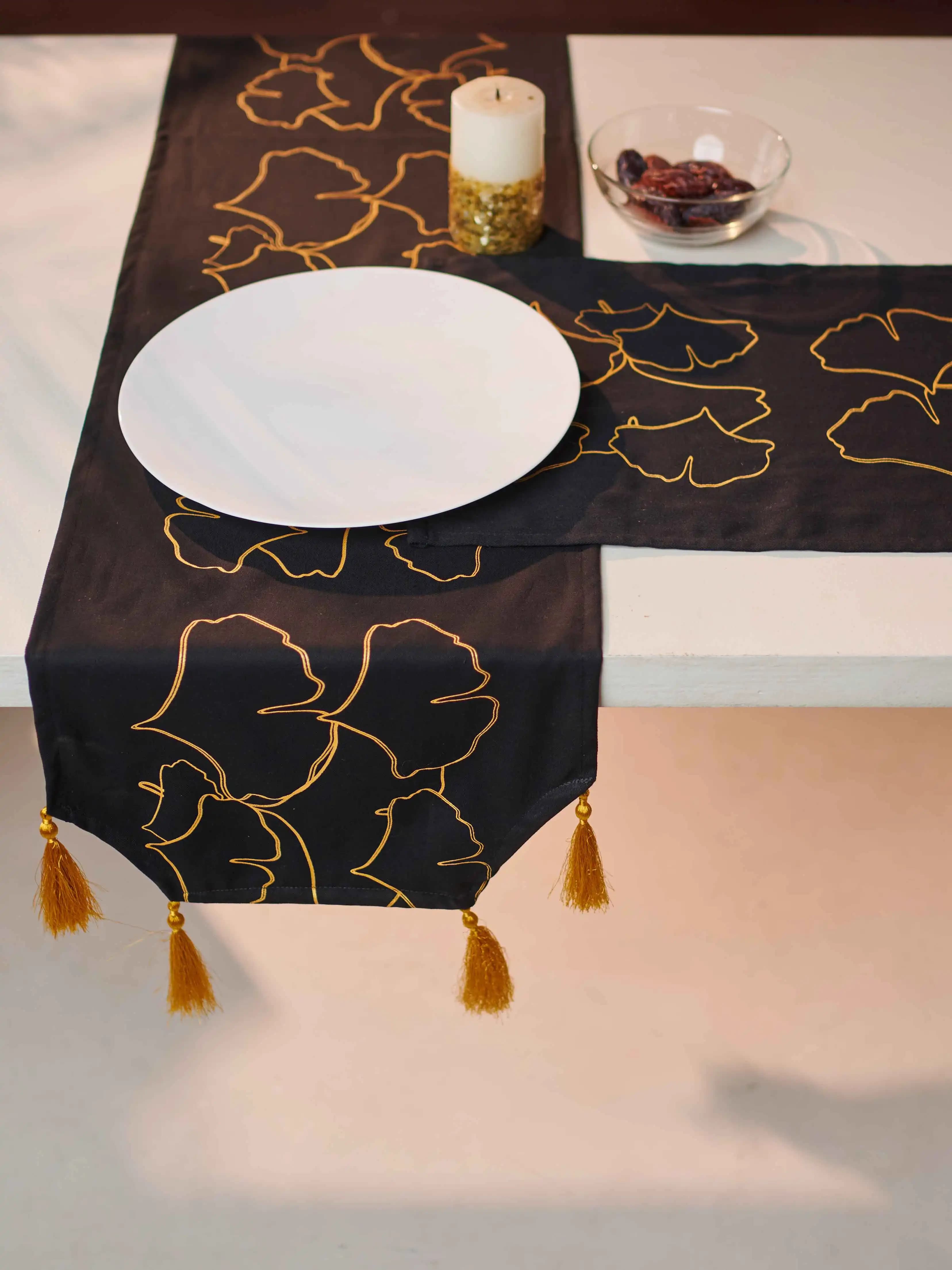 Transform your dining table with the Black Fossil Runner Placement Set. This set includes a half-hexagon-shaped runner and placemats, made from twill fabric with Afsan screen printing, finished with elegant tassels.