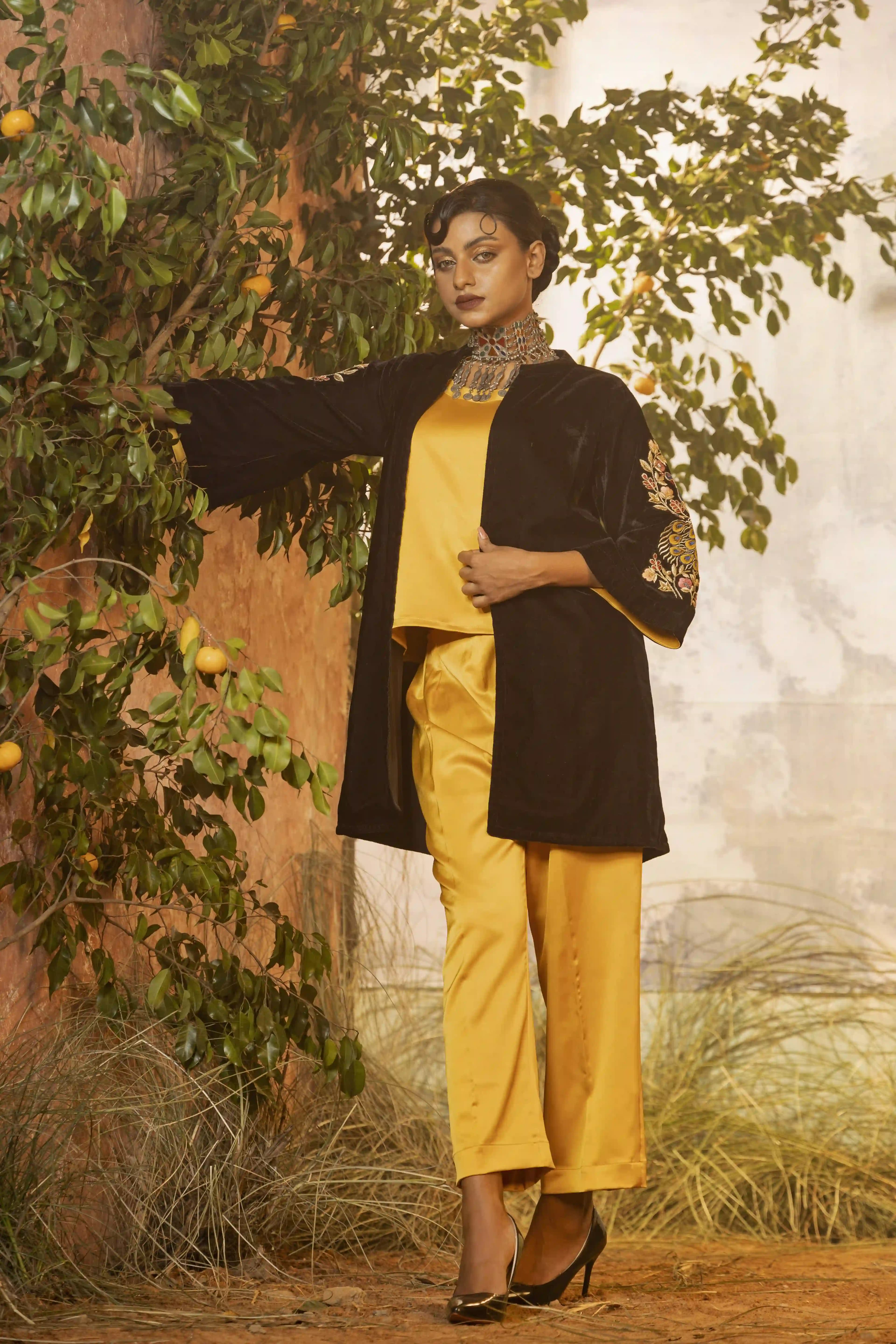 Stay warm and stylish this winter with our exclusive three-piece velvet shrug set. This cozy set features a soft and comfortable velvet koti, a delicate momo silk pank, and a matching inner layer with intricate embroidery and karchupi work. The perfect outfit for any occasion, dress it up for a special event or keep it casual for everyday wear.