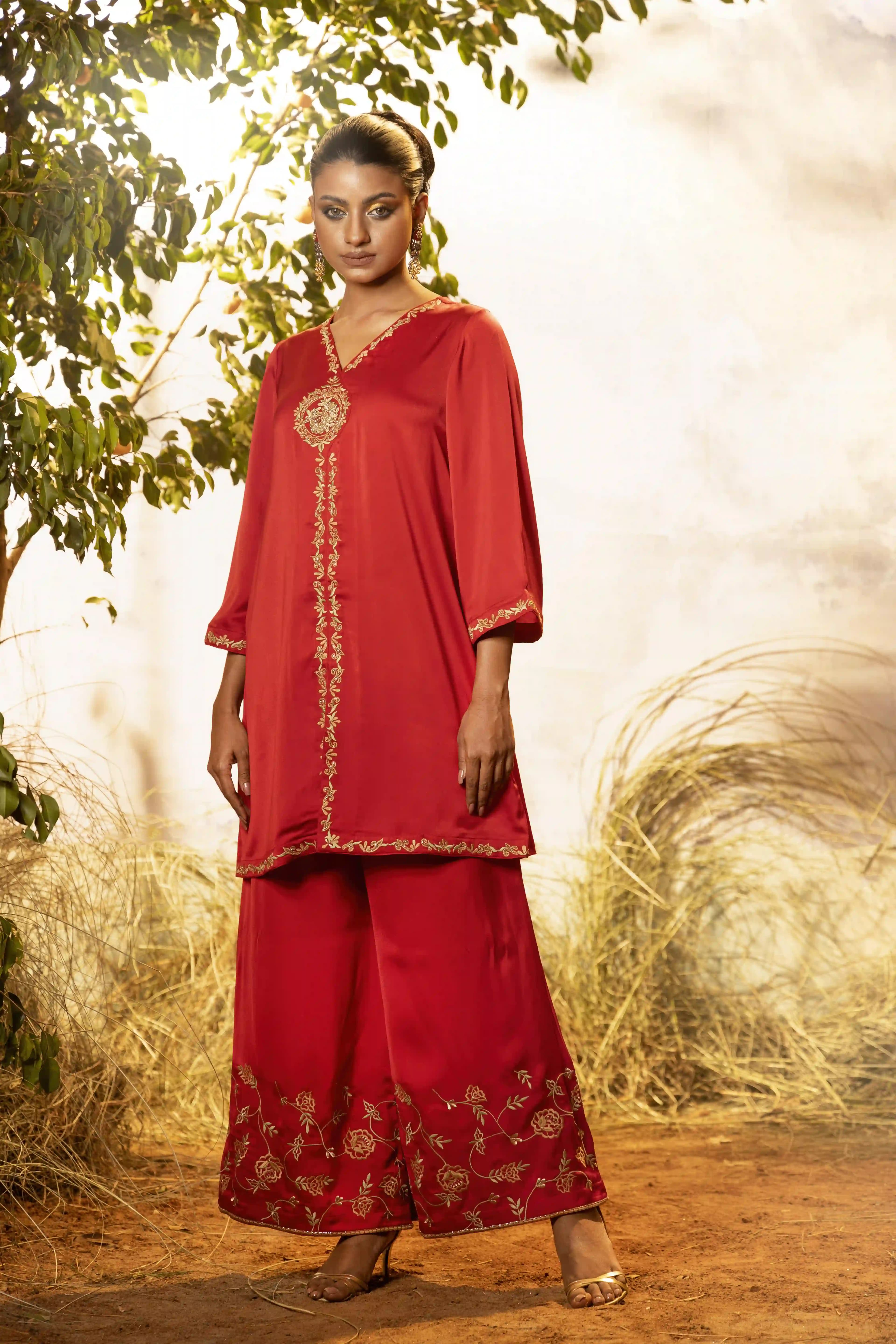 Indulge in the rich comfort of Momo silk this winter with our stunning two-piece ethnic set. Exquisite embroidery and hand-stitched karchupi work add a touch of elegance to this cozy ensemble, perfect for any occasion. Available in a vibrant red hue, this set is sure to turn heads and keep you warm all season long.