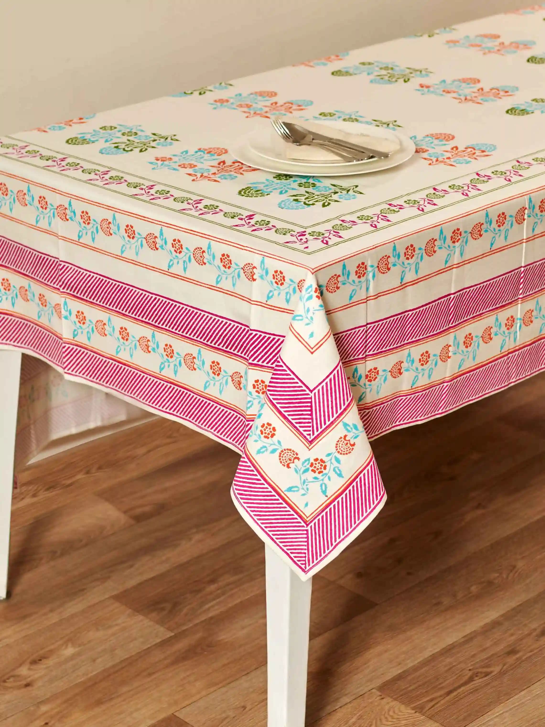 Brighten your table with this vibrant, block-printed cotton tablecloth. The multi-color design adds a lively touch to any dining space. Made from soft, durable cotton, it’s perfect for everyday use or special occasions. Easy to care for and machine washable for convenience.