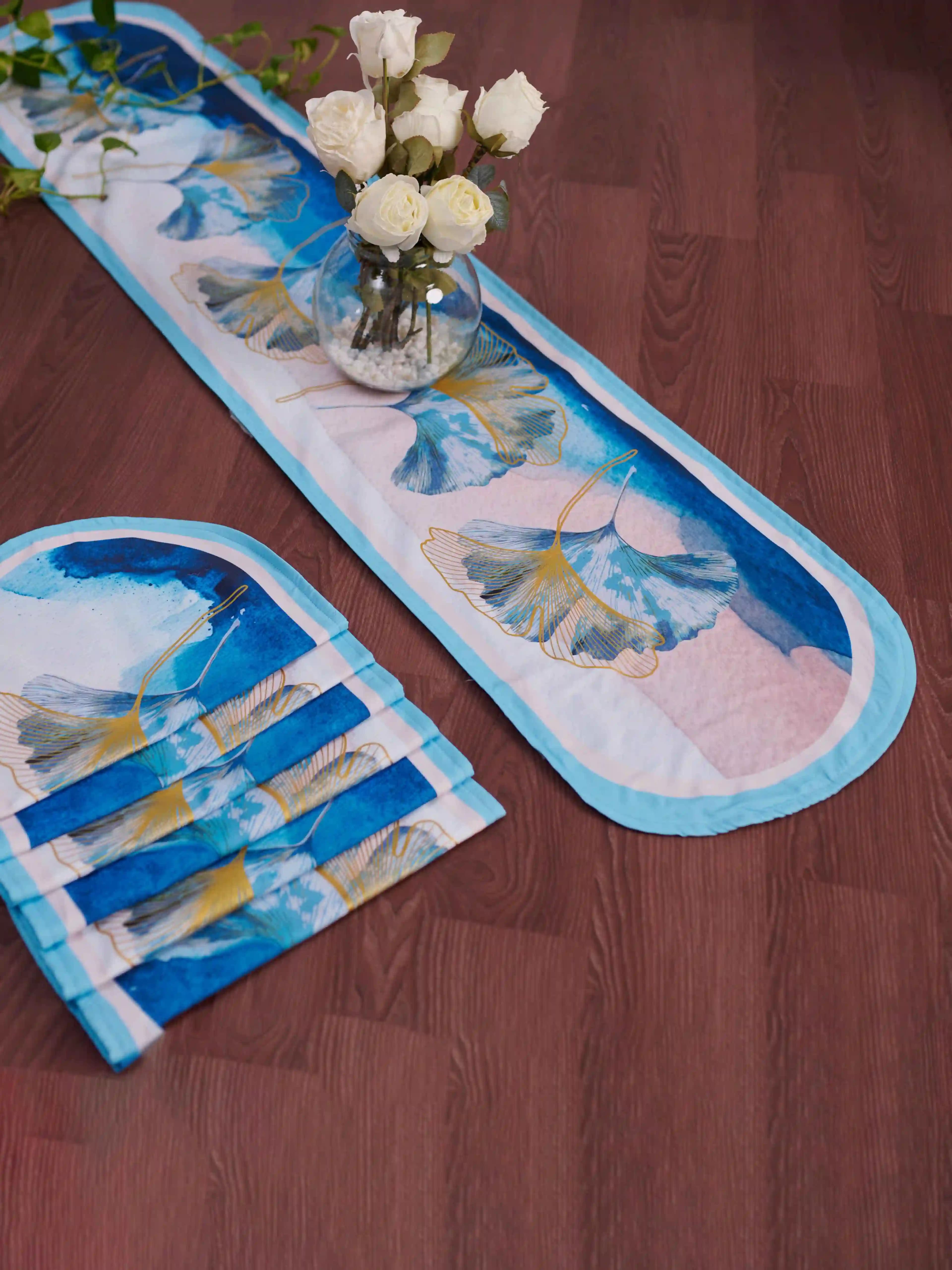 Elevate your dining table with the Fossil oval runner and placemat set. This 6-piece set includes a stylish runner and coordinating placemats, crafted from durable polyester and twill fabric. Available in blue, aqua blue, and green shades, it’s perfect for adding a chic touch to your meals.