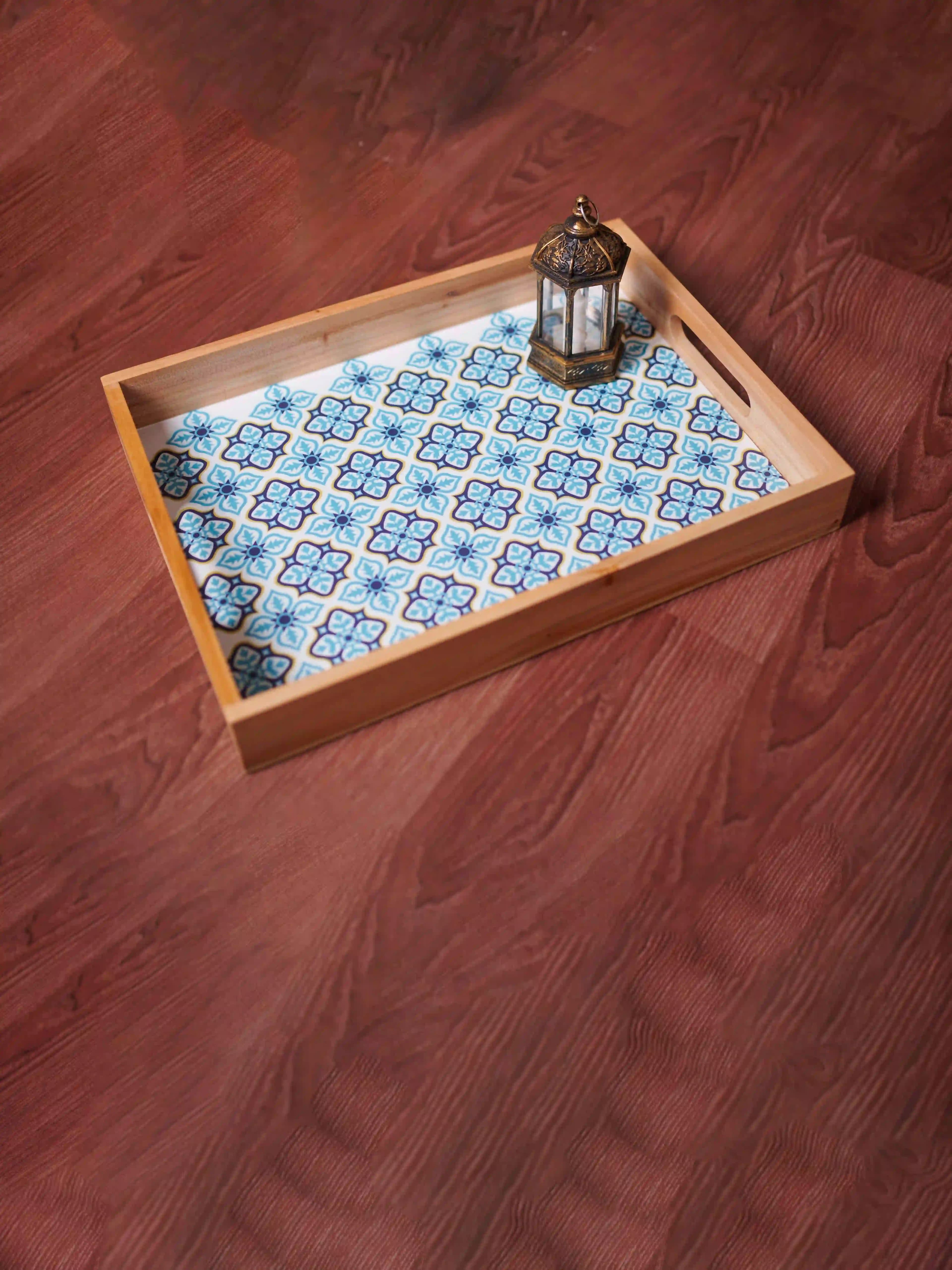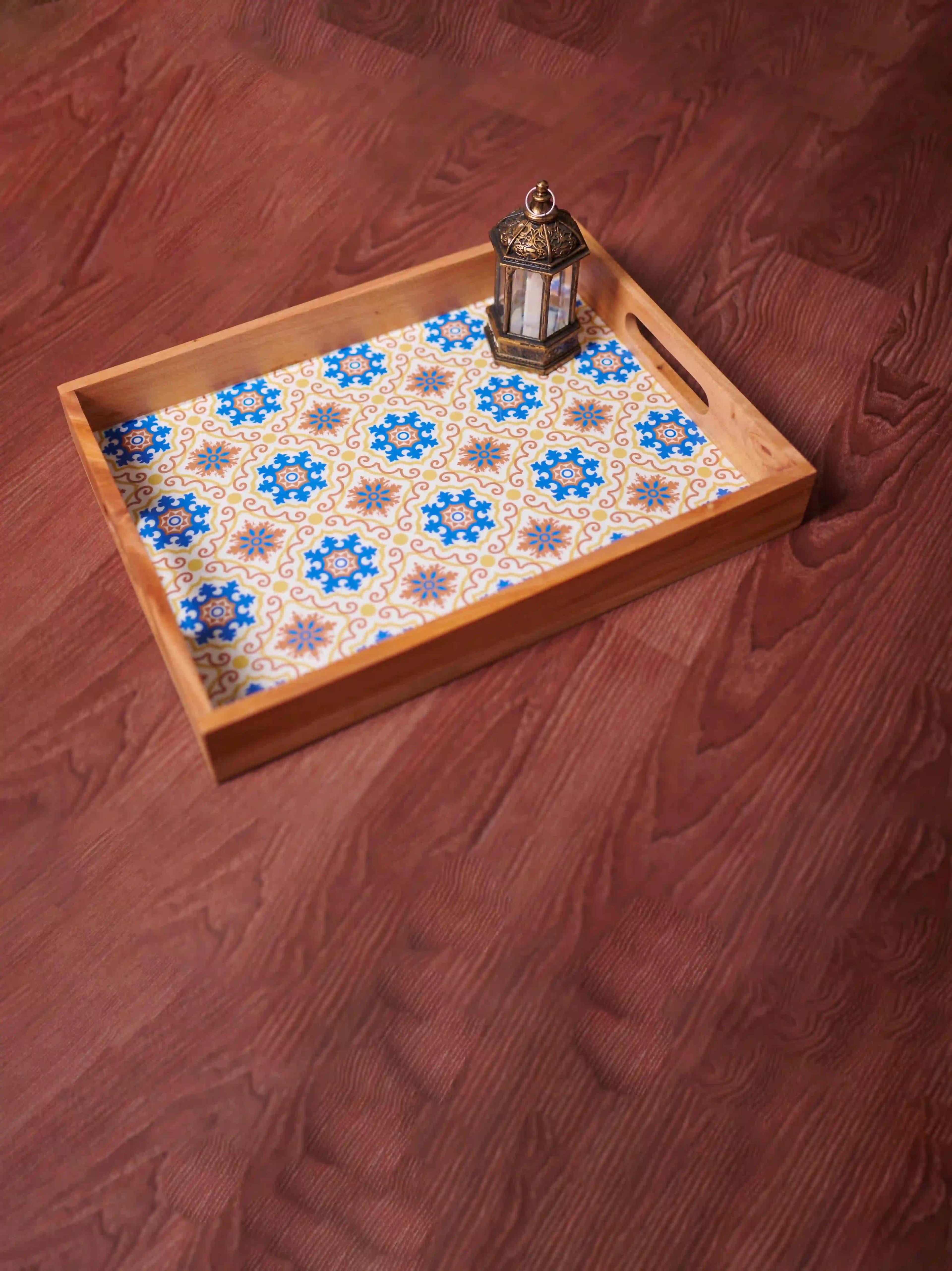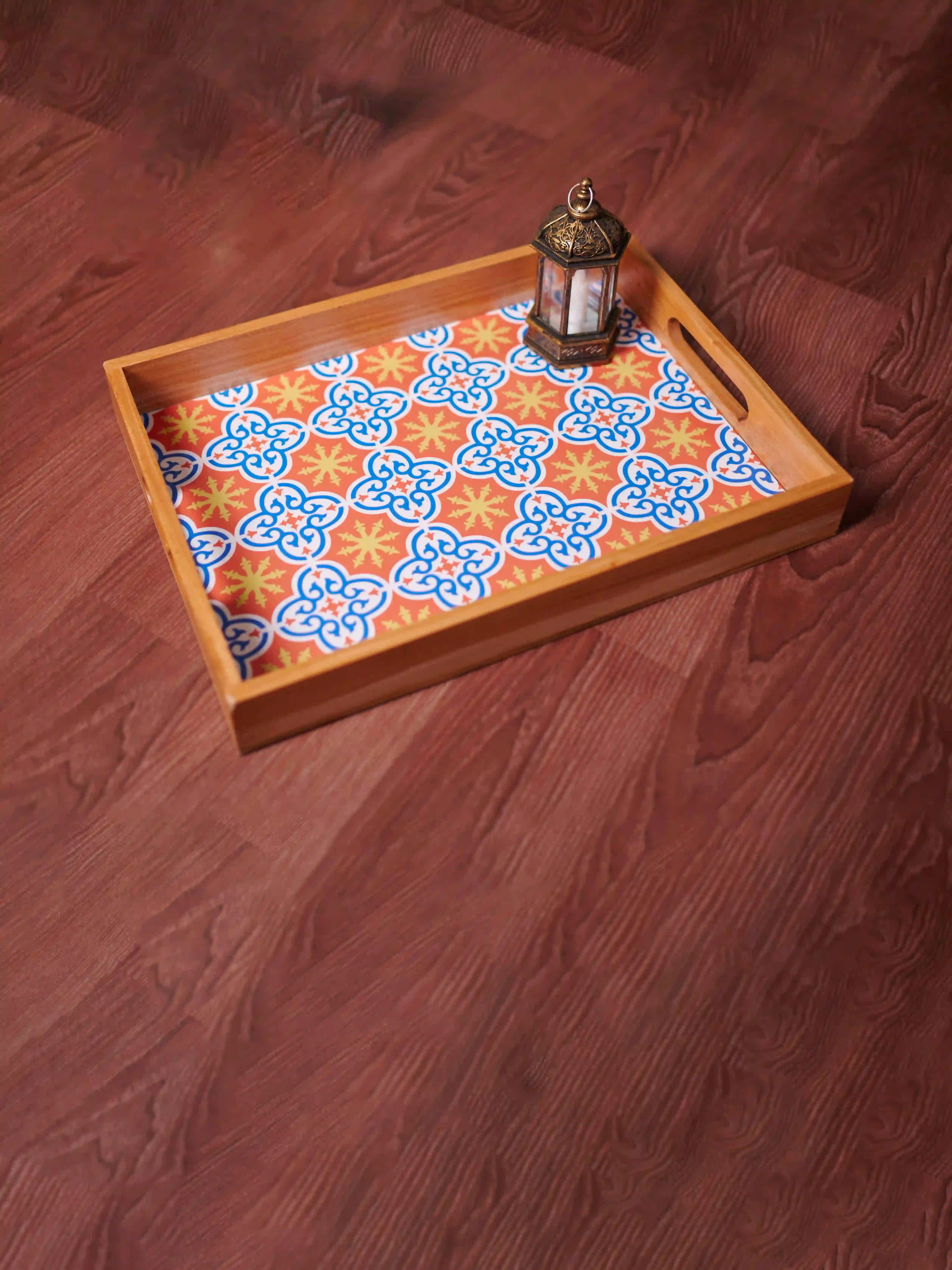 Description: This large serving tray is made from handcrafted mahogany wood and features a beautiful Iranian motive. The tray is perfect for serving drinks, snacks, or as a decorative piece for your home.
