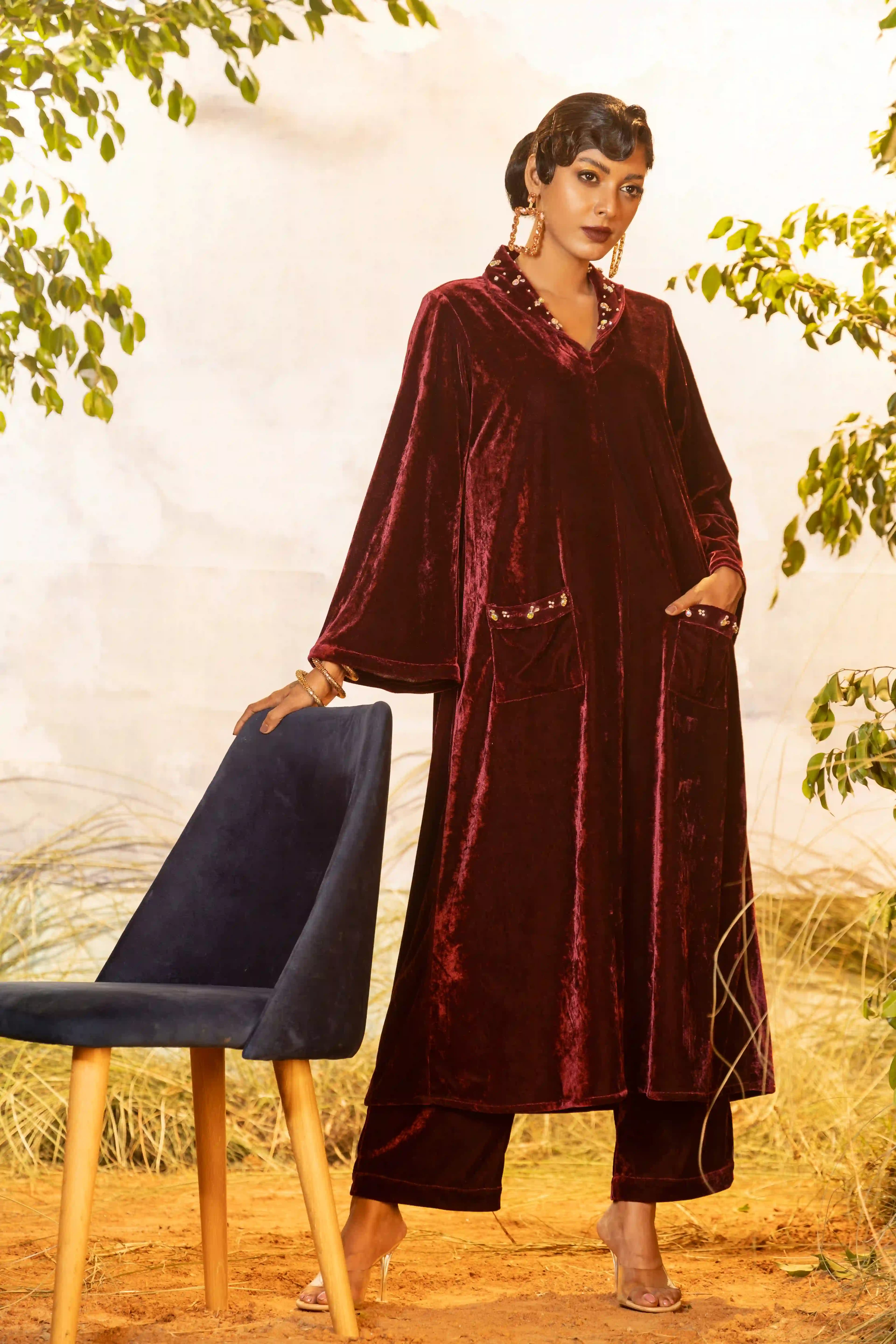Cozy up in style this winter with our stunning Two-Piece Set from KARUJ IN STYLE. This exquisite ensemble combines modern elegance with traditional ethnic charm, making it perfect for any special occasion. Crafted from buttery-soft velvet and adorned with delicate hand-stitched karchupi stonework, this set is guaranteed to turn heads.