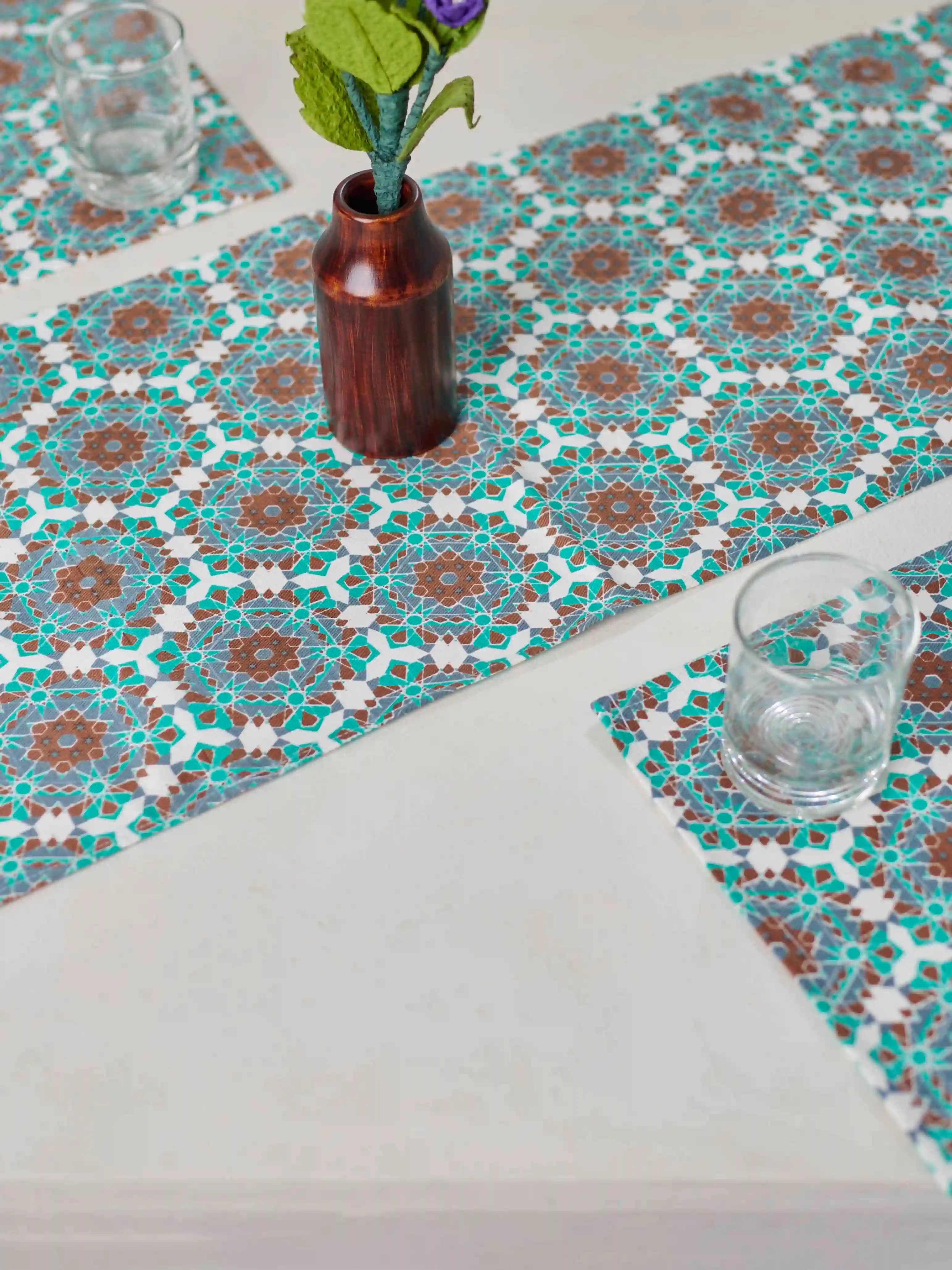 Spruce up your dining table with this elegant table runner set from Kaaruj. Made from 100% cotton twill fabric, this set includes a 60-inch long runner and six placemats. It's perfect for adding a touch of sophistication to your next meal.