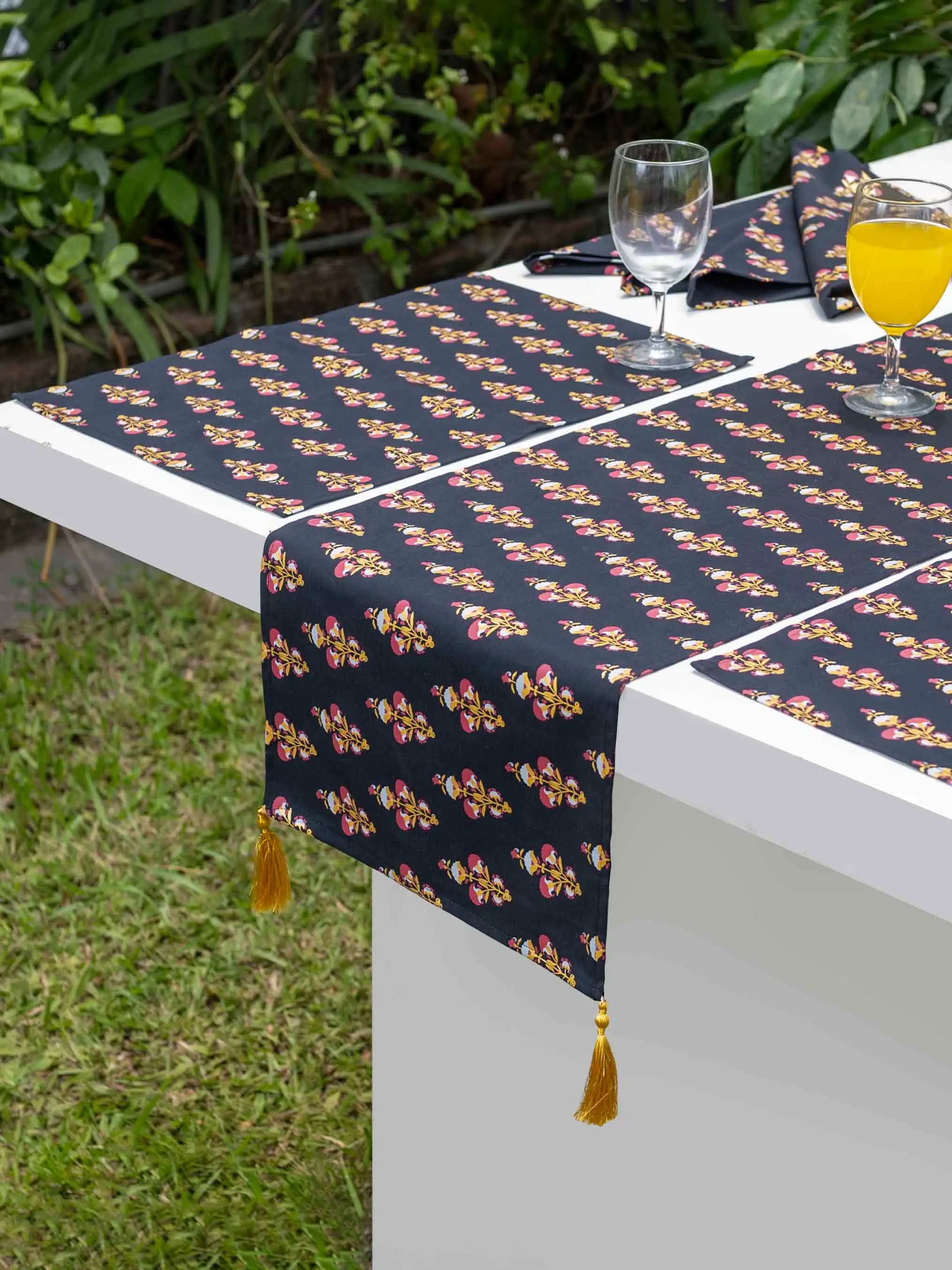 Enhance your dining table with this stylish Suzani runner and placemat set. Made from durable twill fabric with a screen-printed design, it adds a pop of color to any table setting. Available in purple, maroon, black, soft pink, and sea green.